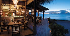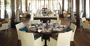 Рестораны шикарные, с очень вкусной едой (порции огромные, международная кухня) и отличным сервисом. Находятся в разных концах острова, доехать можно на велосипеде или багги. В основном ресторане можно сидеть в красивом зале, а можно на белоснежном побережье, любуясь прекрасными живописными видами.